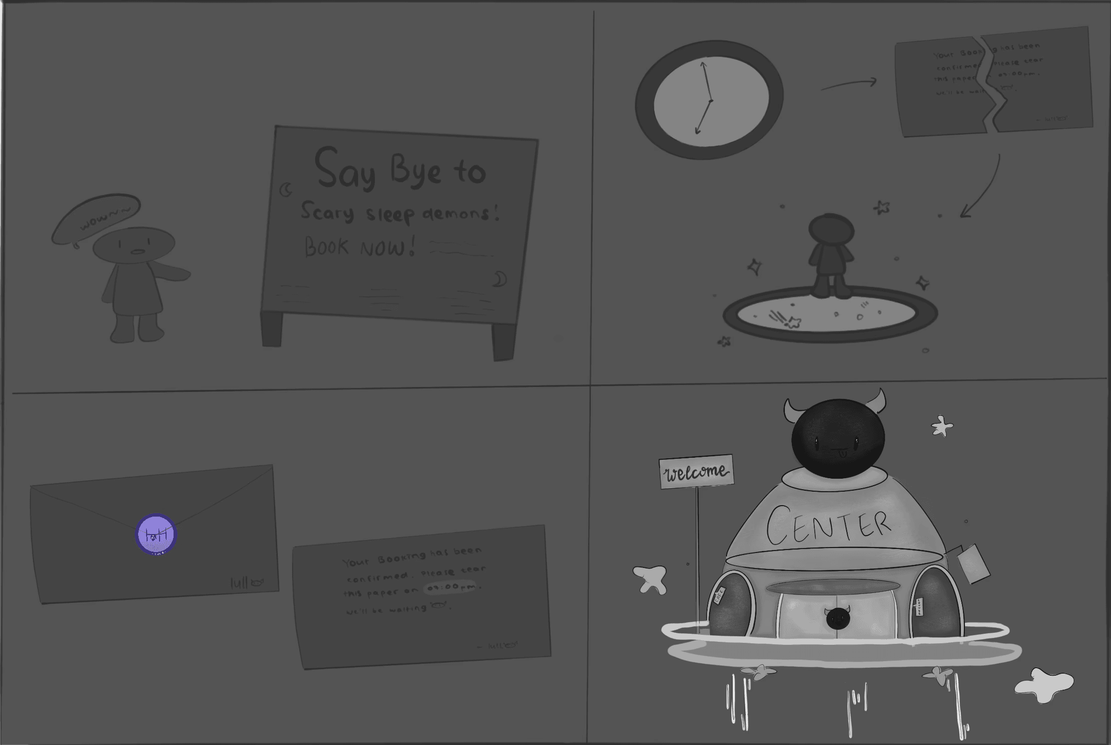 This project explores the creation of a speculative product set in a dystopian reality, where fast-paced lifestyles leave little room for rest. The brief called for an original and imaginative concept, with a focus on developing a compelling design through experimentation across tools, storytelling, and visual execution. Lull is a conceptual sleep centre that reimagines rest by integrating sleep paralysis “demons” into everyday life. Users design personalised lamps that summon these entities to complete tasks while they sleep, allowing them to reclaim time and energy. Blending dark humour with social commentary, the concept reflects on modern productivity culture, offering a playful yet thought-provoking take on outsourcing the mundane to focus on what truly matters.